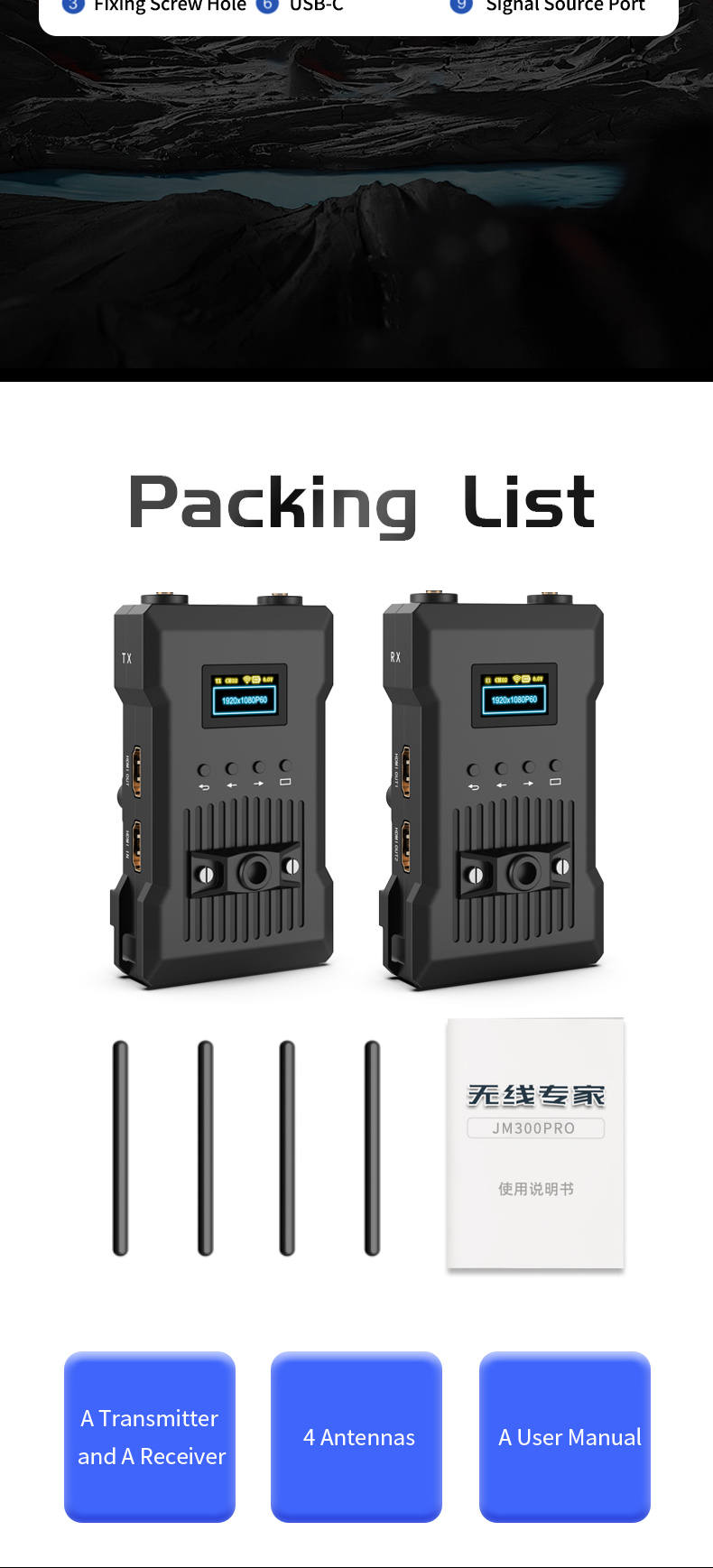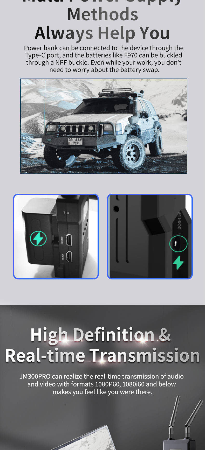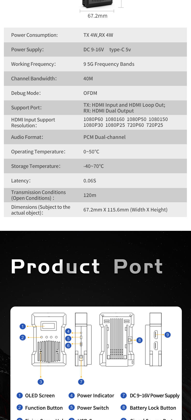 - High-Quality Transmission: Capable of transmitting video up to 4K resolution at 30 frames per second (fps), with support for HD 1080P and 720P resolutions as well.